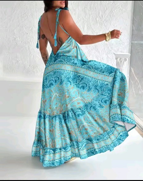 Women's fashionable casual printed V-neck lace up thin shoulder strap long skirt casual A-line smoked dress 2025 summer new item