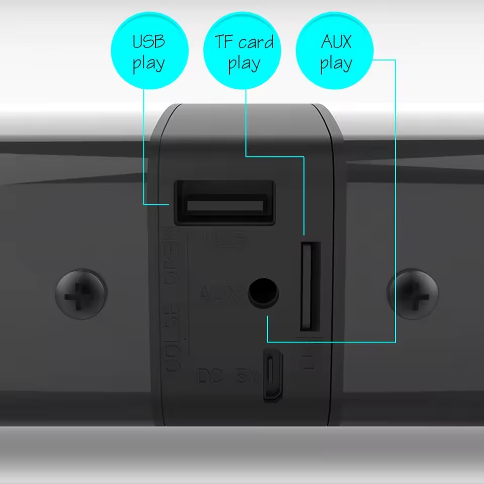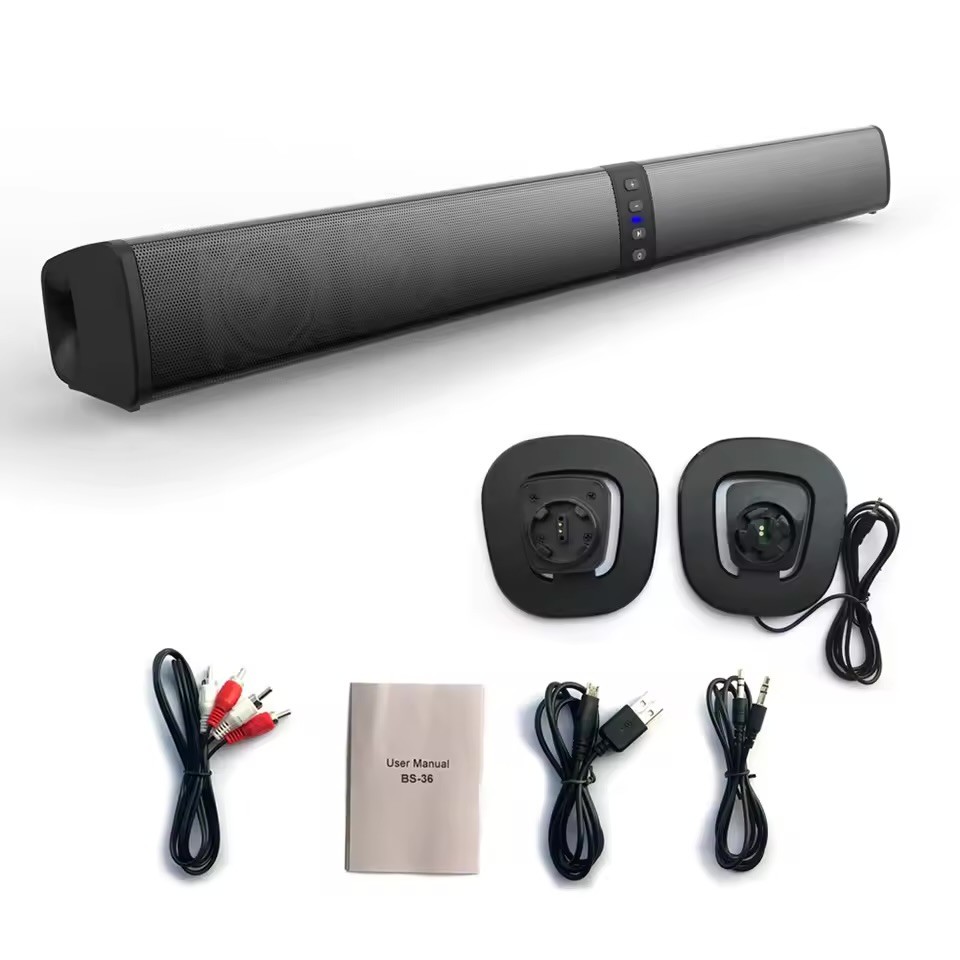 Channel:2.0 1. Bluetooth version: V4.2 2. Speaker: 5W*4 3. Bluetooth distance: 10M 4. Battery capacity: 2000mA 7.4V 5. Nominal voltage: DC 5V 6. Music playing time: about 3 hours. 7. Standby time: 120 hours. 8. 1A Charging time: about 4 hours. 9. Audio Input: Bluetooth, USB, 3.5mm Aux, TF card 10.Dimension: 490 x 50 x 50mm / 19.29 inch x 1.97 inch x 1.97 inch 11.Net Weight: 731g(soundbar:616g dock:115g) 12.FM Radio Frequency: 87.5-108 13.Accessories: charging cable, 3.5MM-RCA cable, 3.5MM audio cable, manual 14.Support TV/PC/Phone/Tablet/Laptop/MP3/M P4/DVD player/TV Box Audio