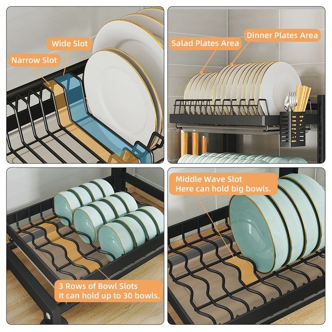 It can hold 4 large bowls, 12 small bowls, 6 small plates and 6 large plates. It comes with a utensil holder and a 2in1 cutting board. The storage of kitchen items gets more convenient and compact.