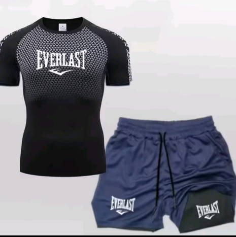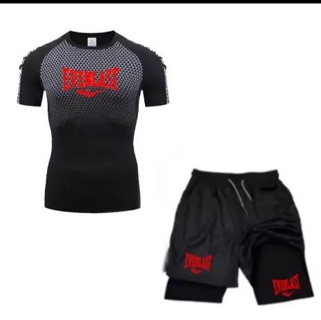 EVERLAST Men's Compress Shirt + 2-in-1 sports shorts 2pcs Set Leisure Breath Short Sleeve Sport Jogging Gym Brand Print Clothing