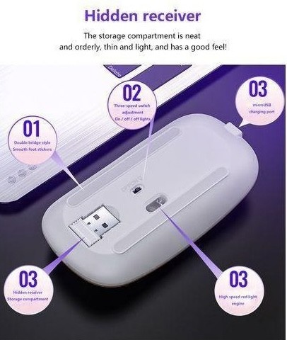 • Rechargeable Wireless Computer Mouse - This USB LED wireless mouse has a built-in rechargeable 500mA battery. If fully charged, it can be used for about 3 weeks; if the battery is low, the mouse light turns off and the cursor movement slows down or does not move. Please charge in time. Of course, this mouse also has an automatic power saving function. After the mouse is powered on for 8 minutes, if not in use, it will enter sleep mode.